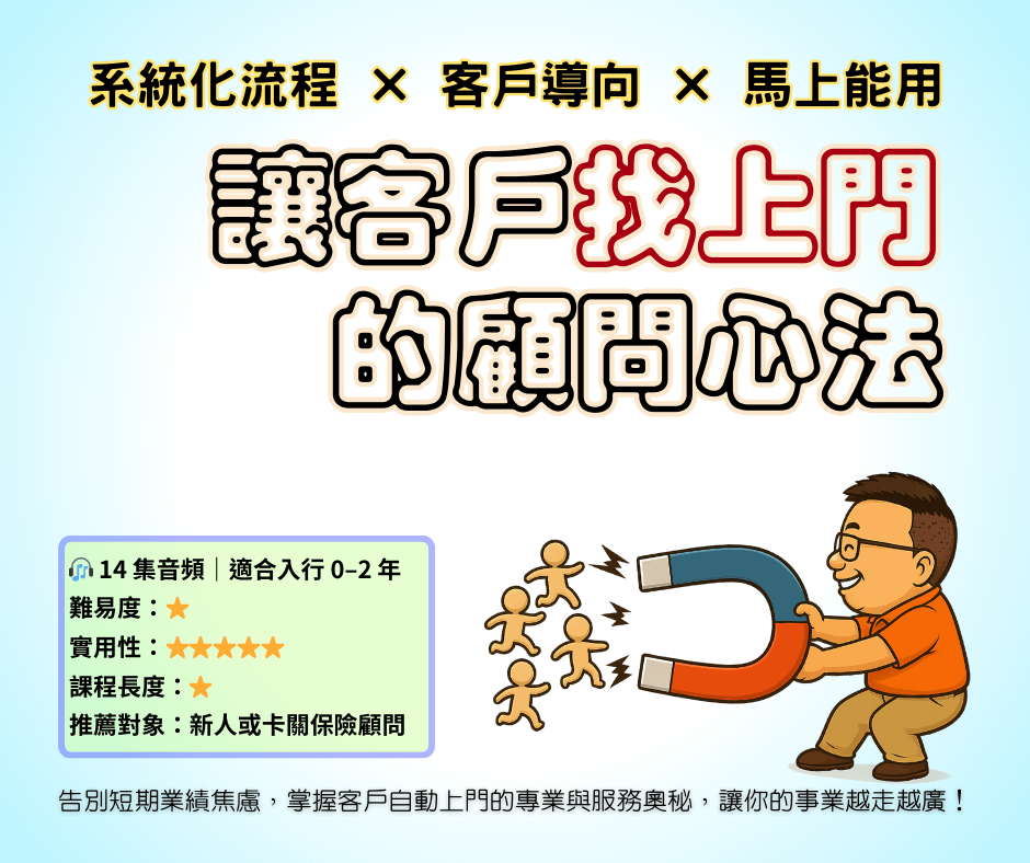 這門課,將帶你從「保險銷售」走向「保險行銷」,從表面招式,進化到影響市場的「顧問心法」。