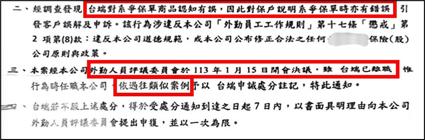【上下圖】保險公司懲處信件小李繼續說道,聲音顫抖:「我只是協助一個以前的保戶申請保險給付啊!這十年來,我根本沒有再賣過這個客戶一張保單。我這幾年也都沒有聯絡客戶,只是她請領生存保險金發生問題,我才出面協助的。」