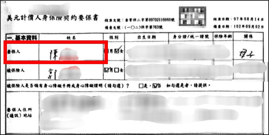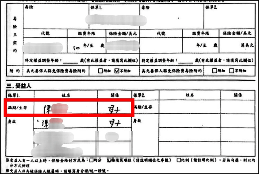【上下圖】要保人、受益人同一人,均為被保險人母親我長舒一口氣,心想:『終於,公理得到了伸張。』我們都以為事情終於告一段落,可以鬆一口氣了。然而,就在我們慶祝勝利的時候,一個意外的消息打破了平靜。