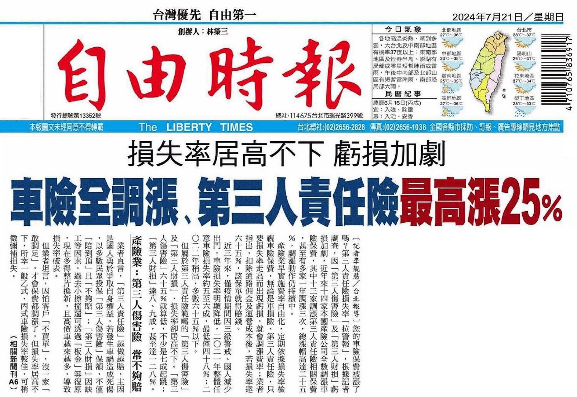 第三人責任險損失率「拉警報」,根據記者調查,因「第三人傷害險」及「第三人財損」虧損加劇,近年來十四家本國產險公司全數調漲車險保費,其中十三家調漲第三人責任險相關保費,甚至有多家一年調漲三次,總漲幅高達二十五%,調漲動作仍持續中。