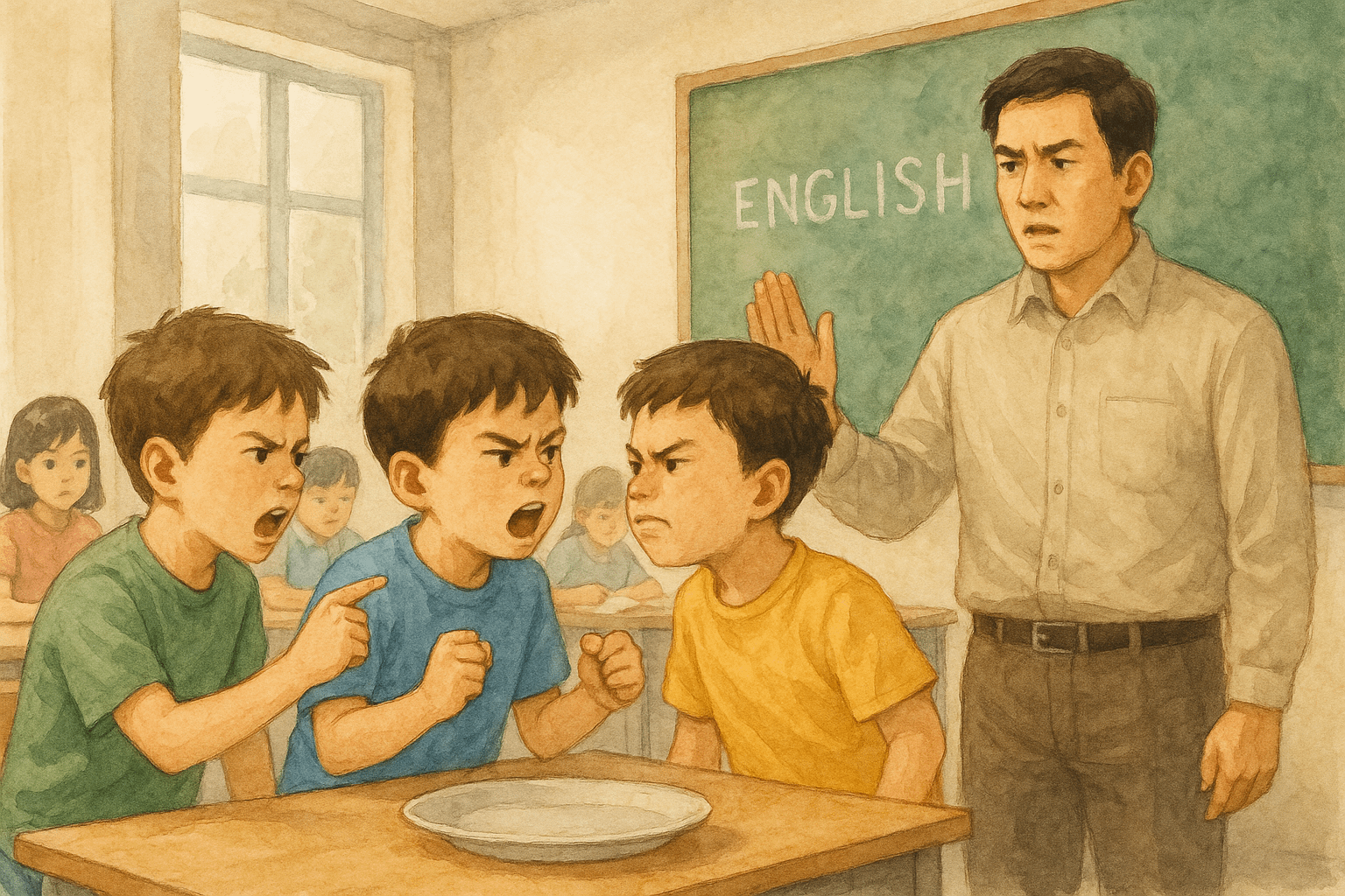 老師說「同學們,安靜一點,你們吵到其他人了!而且,怎麼可以罵三字經!」,同學們摸摸鼻子靜下來,窸窸窣窣的碎念著「管那麼多?罵三字經又怎麼樣了?我們英文成績超好!」