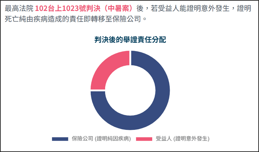 | 最高法院 102台上1023 | 工人因中暑死亡;保險公司主張為內在疾病。 | 舉證責任轉移至保險公司,由其證明死亡係因疾病所致。 | 受益人勝訴 |