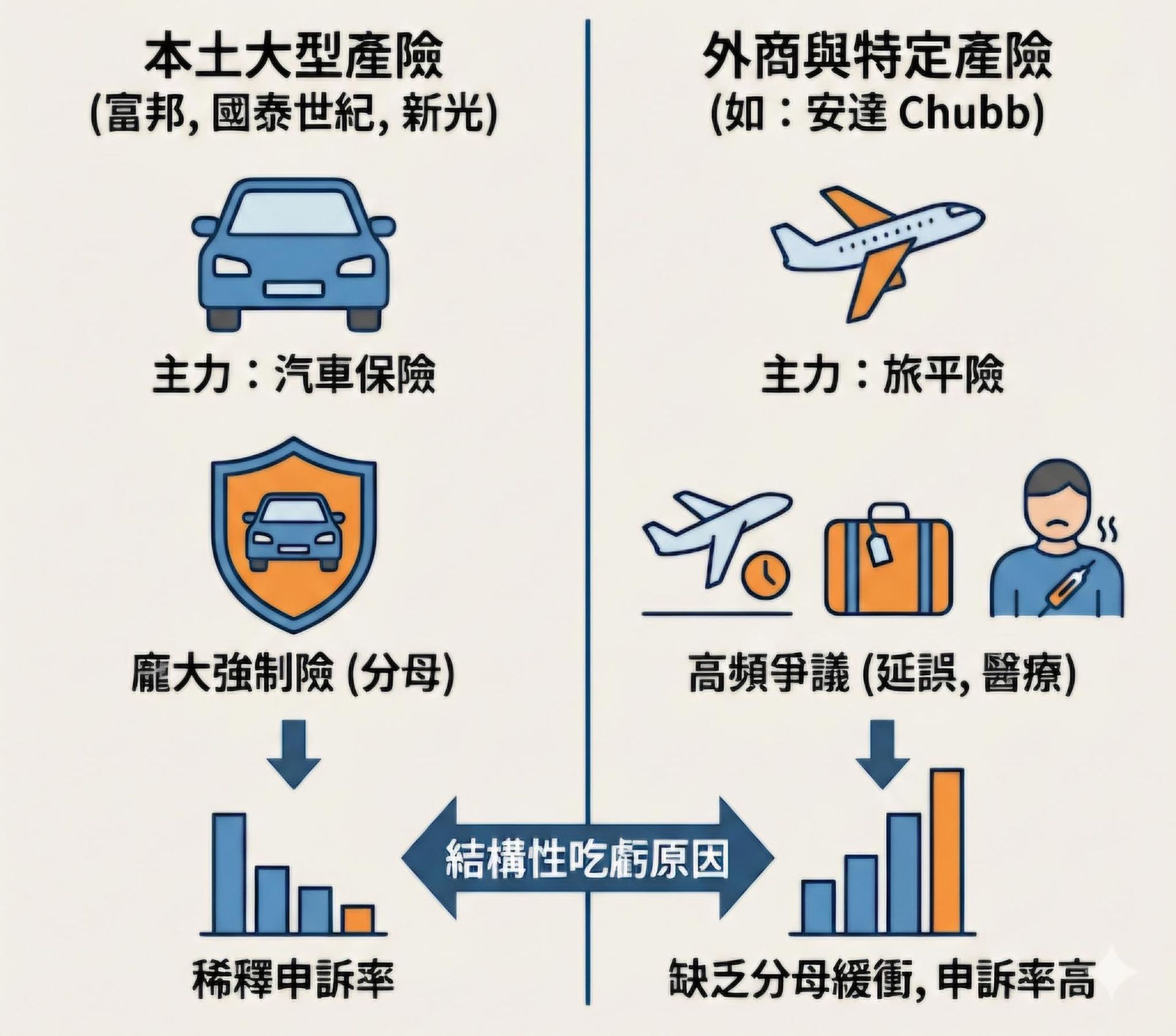 - 缺乏分母緩衝:不像本土產險有數百萬件理賠爭議極低的強制險來當分母。