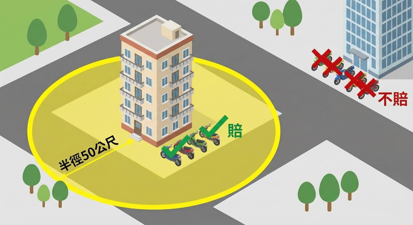 幾乎所有條款都規定:機車必須停放於「保險標的物(你家大樓)半徑 50 公尺範圍內」。