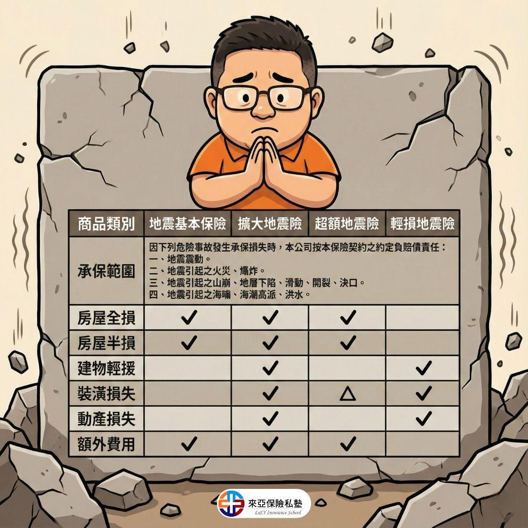 - 台灣產物:輕損地震險具備「排除比例分攤」優勢,即使房屋總價值很高但保額買得低,發生小額損失(如牆壁裂縫)時仍可全額獲得理賠,不會被房價稀釋。