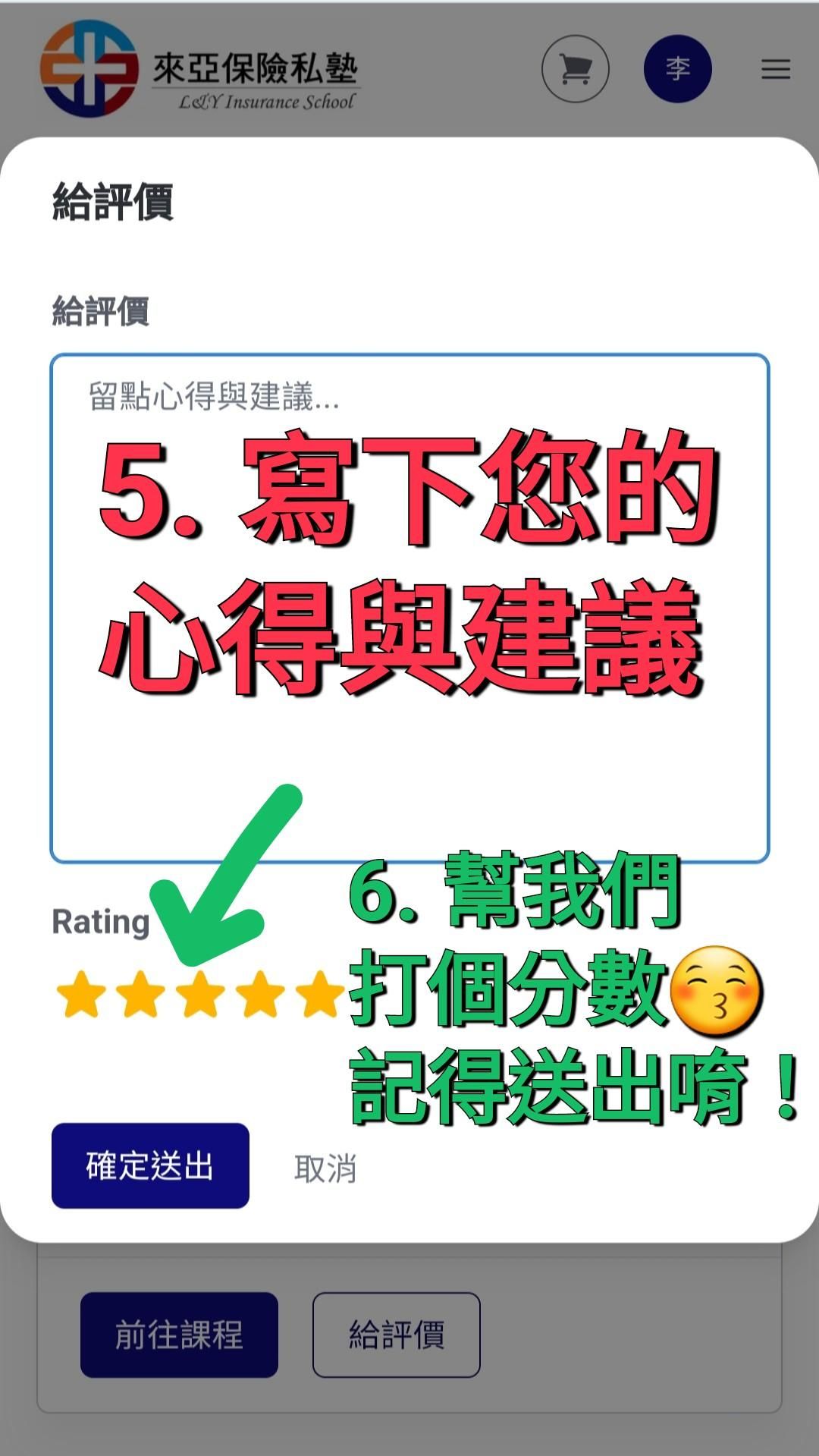 您的每一個評價與回饋,都是我們進步的動力,也是其他學員選擇課程的重要參考!請跟著以下簡單的步驟,花一分鐘幫我們打個分數吧!